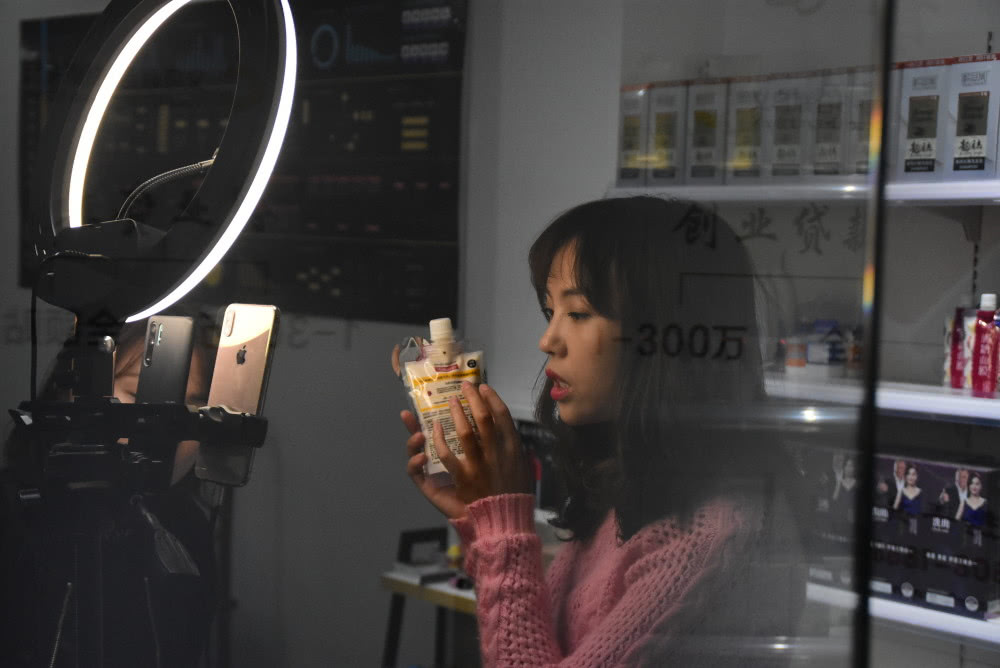 4月22日,在江北下朱村一家电商直播培训机构,主播通过直播销售商品。