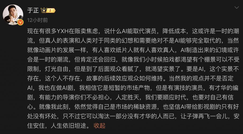 不过,他话锋一转,又说自己也在做 AI 剧,这个东西确实能淘汰一部分没才华的人。