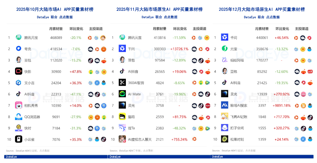 根据DataEye和点点数据联合报告,豆包、夸克、千问、Kimi、星野等非腾讯系APP都是腾讯广告忠实拥趸。