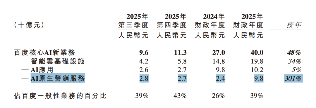 值得注意的还有,从2025年第三季度开始,百度引入了“AI原生营销服务”这一全新披露口径。在这一维度下,2025年相关收入较2024年全年增长301%,释放出“AI正成为核心驱动力”的强烈信号。