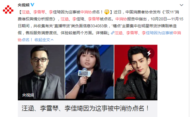 “快手一哥”辛巴被职业打假人盯上被曝出在直播间卖糖水“燕窝”。同时,对于双十一的直播带货,有消费这举报“知名主持人”汪涵直播带货涉嫌刷单造假;“脱口秀演员”李雪琴直播销售数据“注水”,在“口红一哥”李佳琦直播间买的货物不让换等问题,均被中消协直接点名批评。