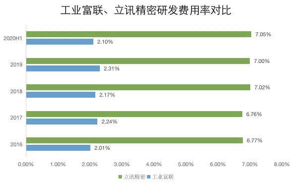 一直以来,立讯精密在智能化设备的采购和研发投入上耗资不菲,其研发费用率连续3年在7%以上,同期,工业富联仅略高于2%。立讯精密2020年半年报显示,公司在未来新品新领域的投入以及针对底层技术研究的相关投入,约占整体研发费用30%。
