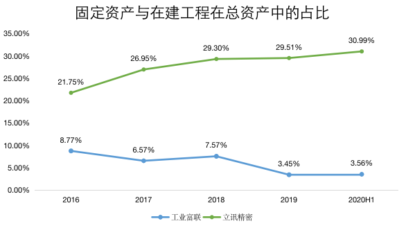 在资产端,截至2020年6月30日,立讯精密总资产为536.81亿元,而工业富联为2011.66亿元,这是业内沉淀时间多寡的结果。在二者总资产逐年渐增的趋势之上,立讯精密压力越来越大,其固定资产与在建工程在总资产的占比逐年提升,这说明立讯精密仍需要大量资本投入来扩大规模,而基本完成产线布局的工业富联已经是轻资产模式了。