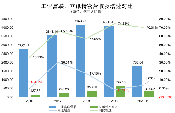 收入端来看,差距仍然悬殊。2019年,立讯精密营收625.16亿元,不足工业富联的两成。但是,自立讯精密傍上苹果这个大金主以来,其收入增速一直保持在较高的增长区间,工业富联在这一方面显得老态龙钟,动辄出现在负增速区间。
