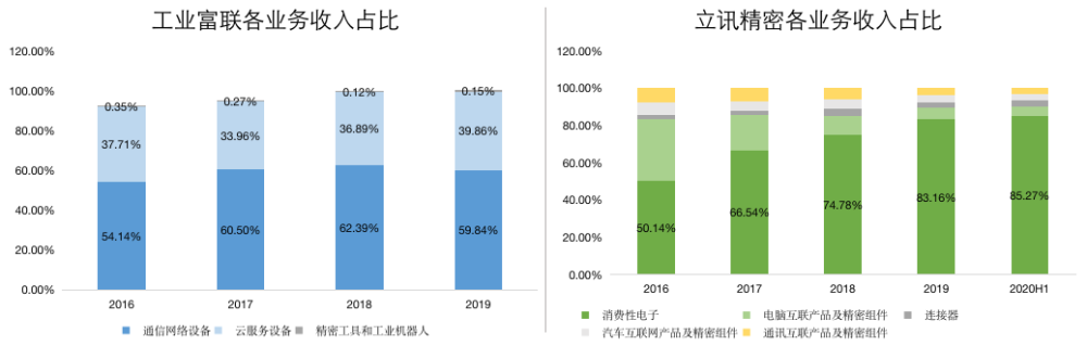 巨人虽然行动迟缓,但收入来源更加均衡,2019年,工业富联的云服务和通信网络收入呈现四六开局面。