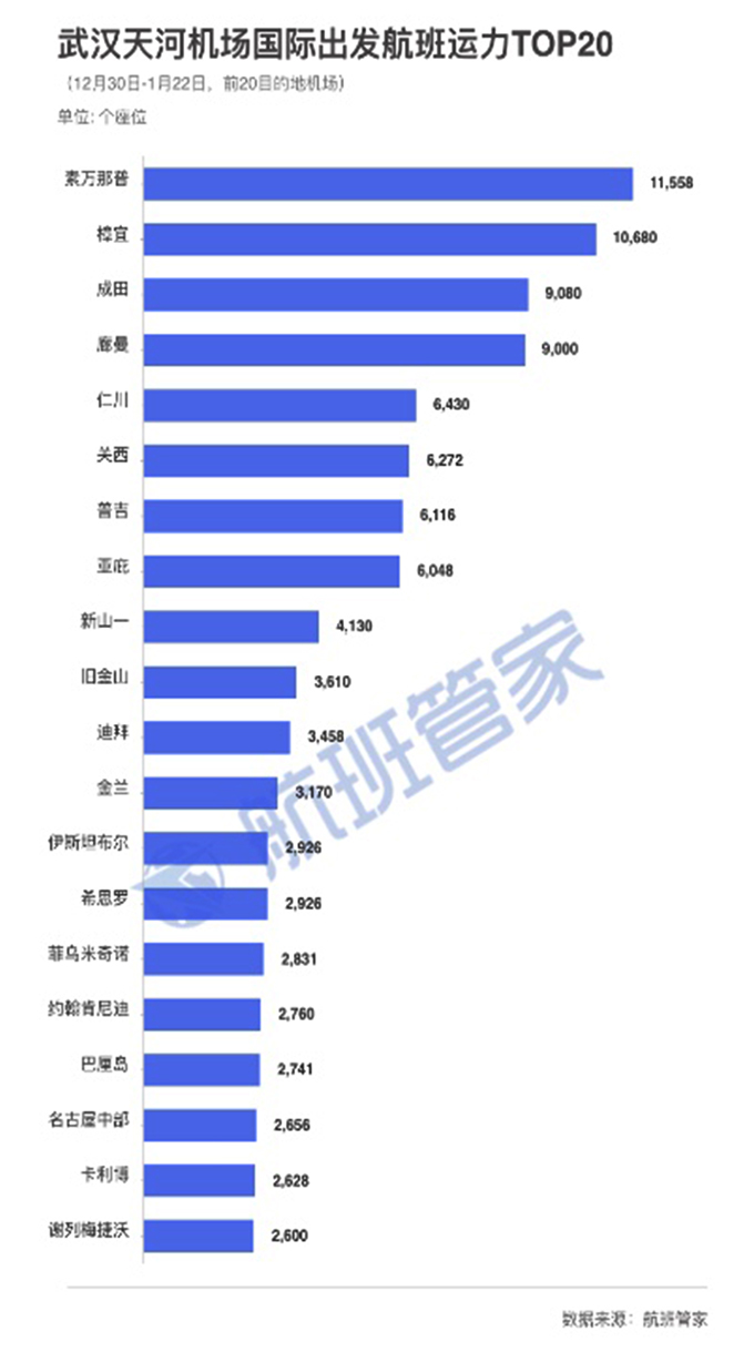 国际方面,武汉出港航班量最大的是泰国曼谷,最多有1万多人从武汉飞往曼谷,出港量排名第二的是新加坡,排名第三的是日本东京。