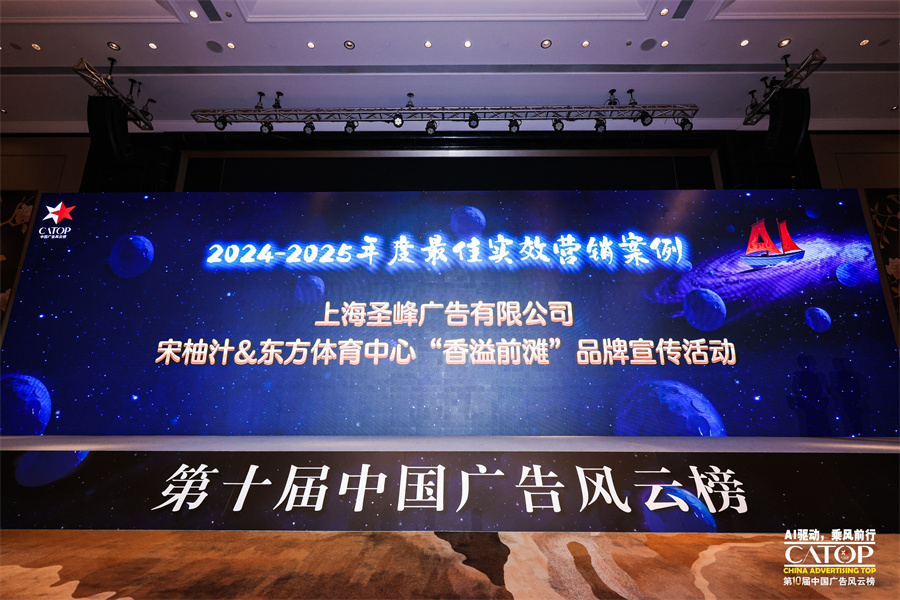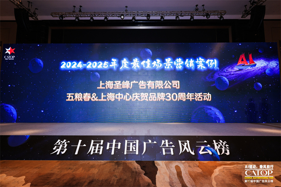 12月5日,以“AI驱动 乘风前行”为主题的第十届中国广告风云榜高峰论坛暨颁奖盛典在长沙隆重举行。上海圣峰广告有限公司(以下简称:圣峰广告)凭借其卓越策划执行的“五粮春&上海中心庆贺品牌30周年活动”与“宋柚汁&东方体育中心‘香溢前滩’品牌宣传活动”,从众多优秀案例中脱颖而出,分别成功斩获“2024-2025年度最佳场景营销案例”与“2024-2025年度最佳实效营销案例”两项大奖。