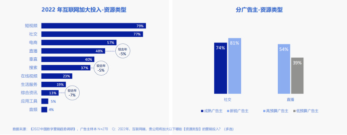 综合来看,社交媒体平台在用户强互动、构建信任度以及长效经营方面,具备天然的优势,也是品牌需要重点投资的媒体类型。广告主调研数据也印证了这一点。《2022中国数字营销趋势报告》数据显示,在新的品效目标下,广告主媒体投资策略发生显著变化,77%广告主加大对社交媒体投入,既能做“品”也能做“效”,并且支持长效品牌资产积累。
