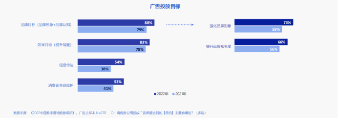 根据秒针营销科学院联合m360、GDMS共同发布的《2022中国数字营销趋势报告》,对于“投放广告希望达到的目的”,有88%的广告主选择了品牌目标,即强化品牌形象及提升品牌认知,占比较去年明显提升,侧重“品”的营销正在回归。
