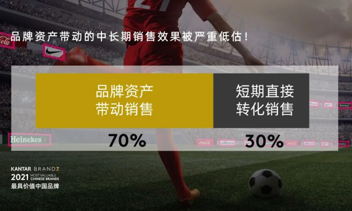 全行业也在重新审视品效关系,并逐渐认可品牌建设对长期效果转化的贡献。凯度做了360个TMROI (Total Marketing Revenue of Investment)的研究,结果显示:品牌资产所带动的中长期销售效果被严重低估了,所有销售中,70%的销售是在中长期发生的,由品牌资产贡献。
