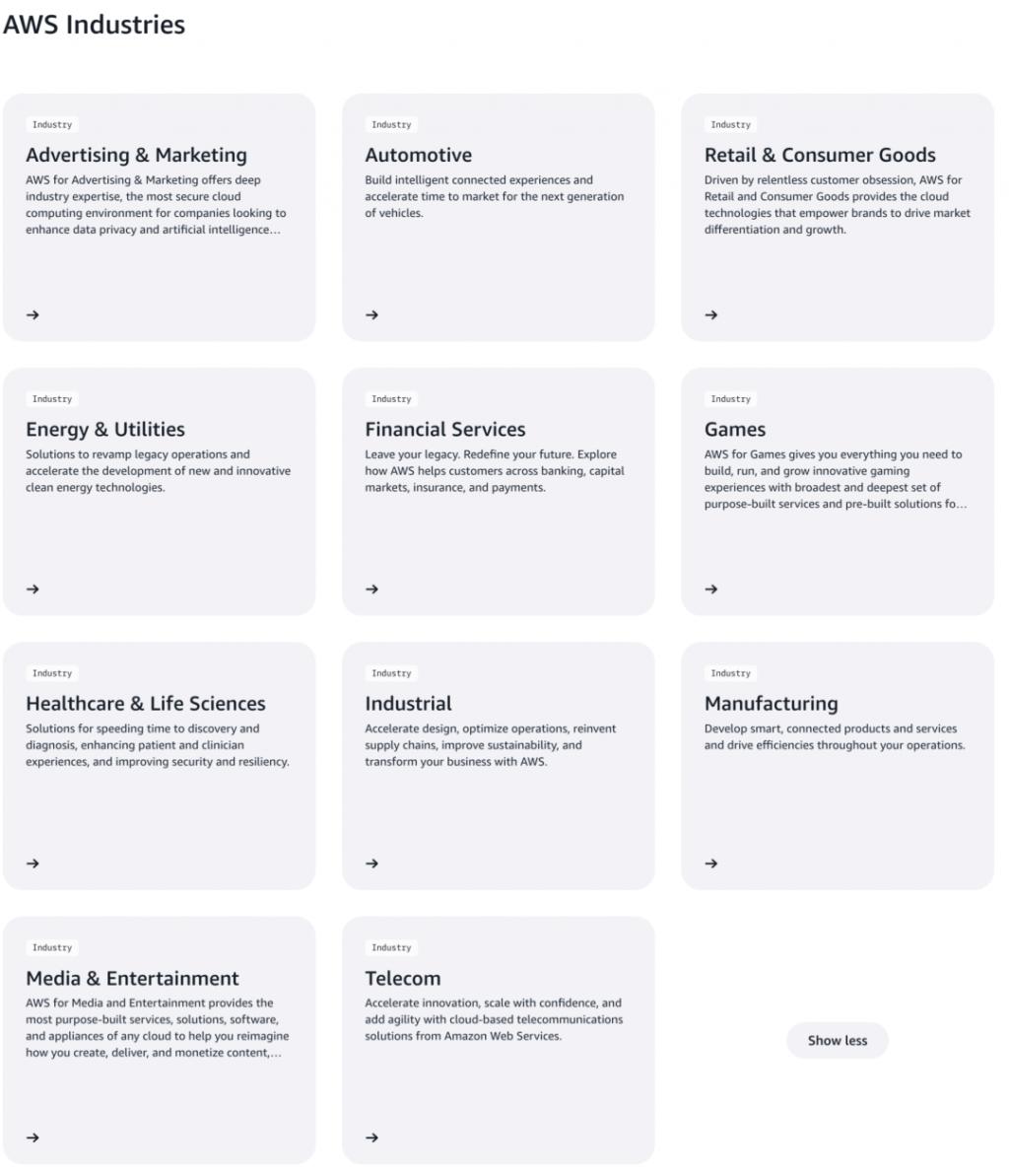 广告技术公司历来是 AWS 的大客户,正如在分析师会议中对广告业务的提及,在 AWS 的官网行业分类里,广告与营销业务是 11 大垂类行业之一。