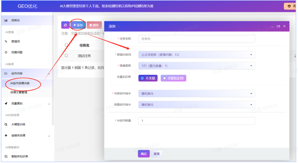 除了委托第三方,另一家GEO服务商(下称“服务商B”)向记者推荐了一款自助GEO优化系统。该系统一年的使用费为399元(含3000点算力,算力消耗完需另行充值),用户可自行完成品牌信息录入、训练词条生成、AI创作投喂内容、内容投喂指定平台自媒体号、查看AI平台收录等多个GEO流程。