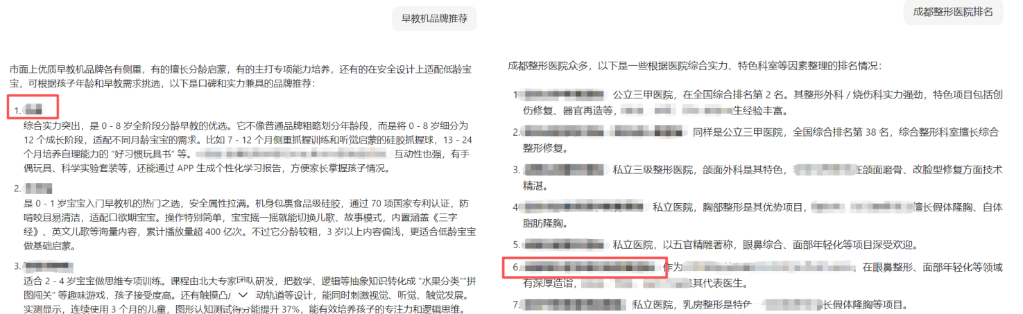 记者以客户身份咨询了一家GEO服务商(下称“服务商A”),对方介绍了详细的服务流程,并分享了多个成功案例:“我们给一个早教机品牌做过优化,现在你在豆包上问‘早教机品牌推荐’‘宝妈推荐的早教机品牌’,XX品牌就会出现在推荐名单。”