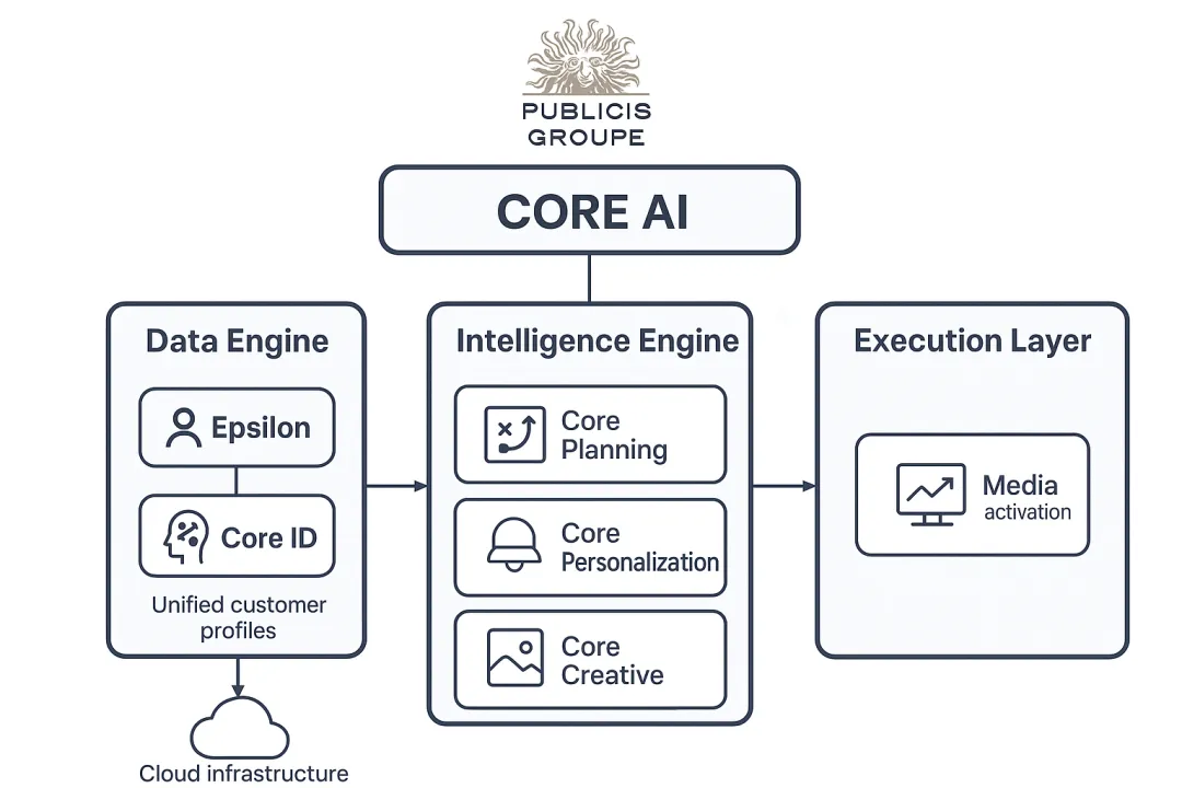 这一增长是其数年前AI 转型战略的结果,阳狮的核心武器是Core AI,一个贯穿全链路的智能中台。它不再将创意、数据、媒体、客户服务视为独立的环节,而是通过 AI 强力地将他们串联在了一起,实现了整合与效率提升。