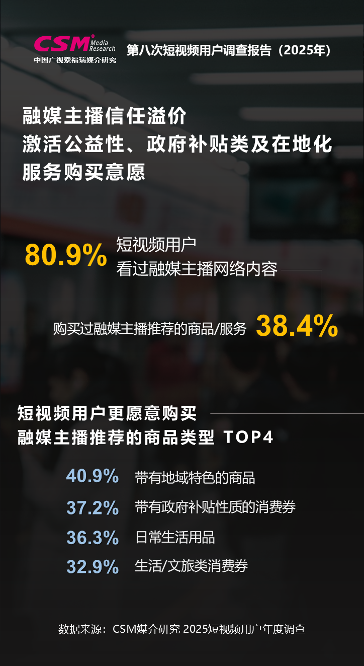 融媒主播内容观看率连续两年提升,信任溢价激活公益性、政府补贴类消费及在地化服务的购买意愿。调查显示,看过融媒主播内容的短视频用户升至80.9%,较2024年增长8个百分点,用户观看黏性同步增强,专业可靠成为连结用户的关键。值得关注的是,融媒主播的信任优势,激活了用户的购买意愿,38.4%的短视频用户表示购买过融媒主播推荐的商品,“参与公益属性的主题直播”“通过现场实验、对比测试,展示商品性能与品质”,这两种推荐或带货形式更能增加用户的购买意愿或对商品信任。超30%的短视频用户表示,更愿意购买融媒主播推荐的地域特色产品、政府补贴消费券、日常生活品、文旅/生活消费券。融媒主播的公益属性、在地化优势获得用户认可。