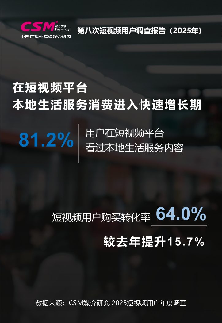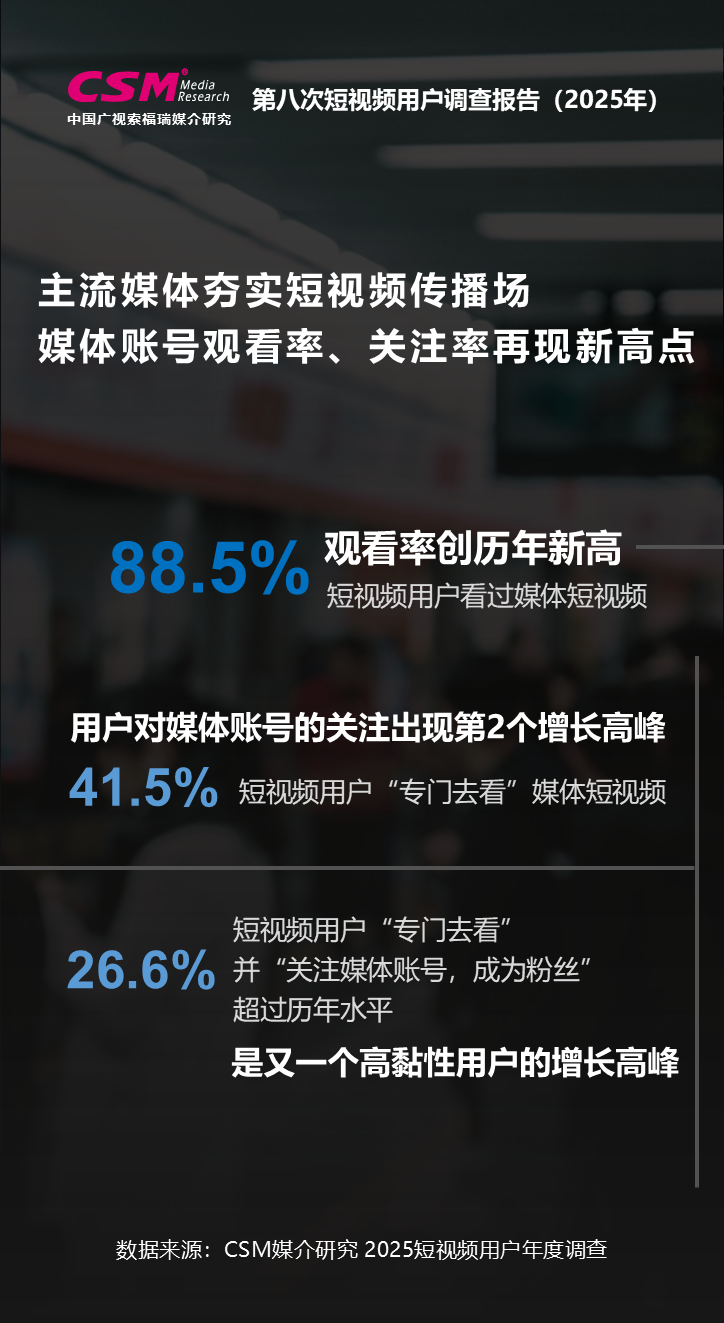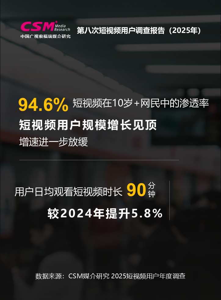 中国广视索福瑞媒介研究(CSM)发布《第八次短视频用户价值年度调查报告(2025)》。