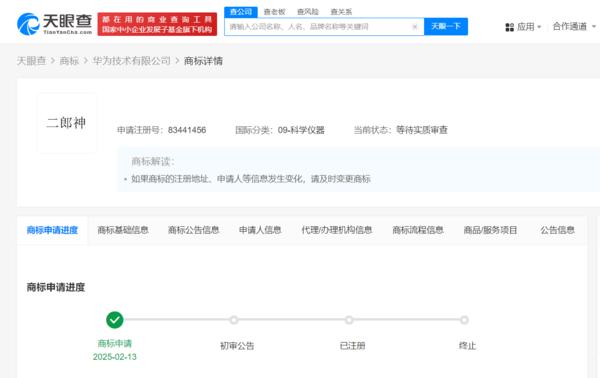天眼查的知识产权信息显示,华为申请了 " 二郎神 " 和 " 雷震子 " 两个新商标,这两个商标被归类于科学仪器类别,目前都处于等待实质审查的状态。