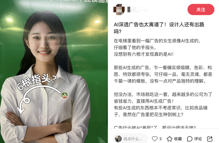 又如电梯广告中出现的AI生成的“六指数字人”。