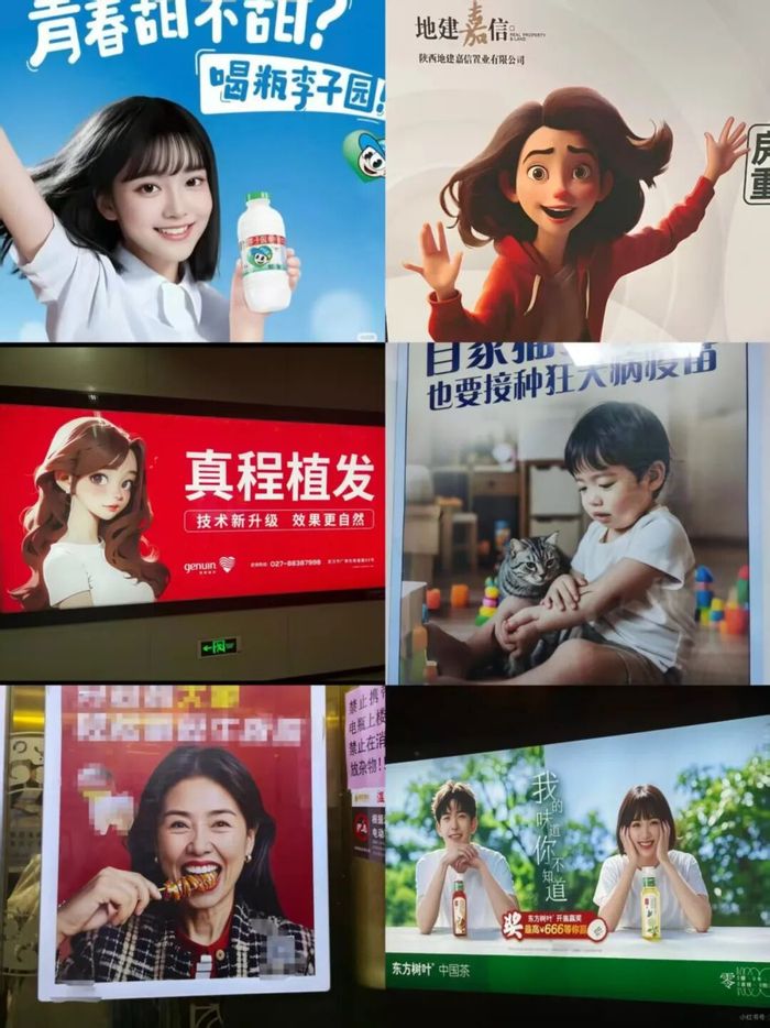 大街小巷随处可见AI生成的平面广告,从公交车站到商场门口,从地铁车厢至电梯间,无处不在。