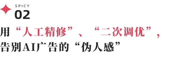 AI 并没有真正意义上解放人工,很多环节还是需要人去把关、修正甚至重做。在“人工精修”干预下,能很大程度上弱化AI广告的“伪人感”。