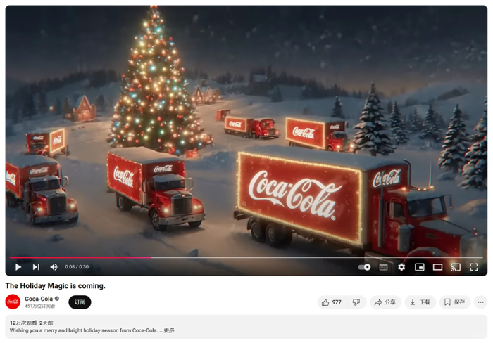 上文提到的可口可乐圣诞AI广告就是代表性案例,单纯靠AI生成的视频内容无法完全满足市场期待。