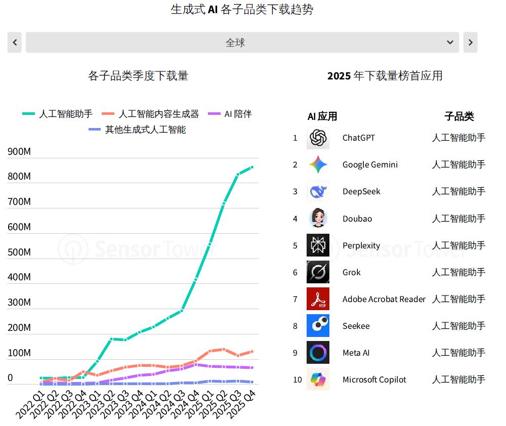 据 Sensor Tower 发布的《2026 移动应用市场报告》,全球 2025 年 AI 应用下载量 TOP6 分别为 ChatGPT、Gemini、DeepSeek、豆包、Perplexity 和 Grok。