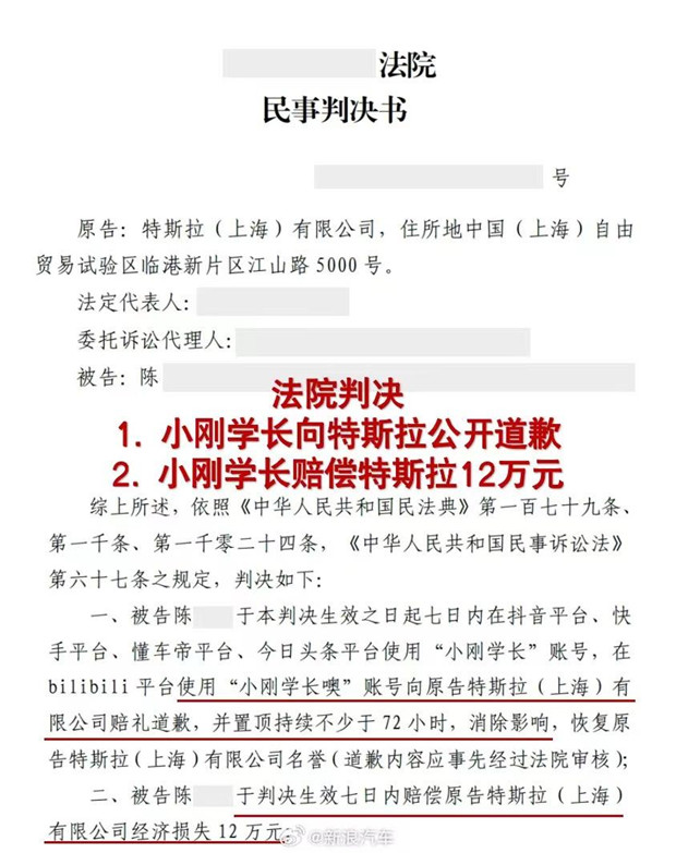 近日,法院经过审理认定小刚学长侵权责任成立,判决其应向特斯拉公开道歉并赔偿12万元。