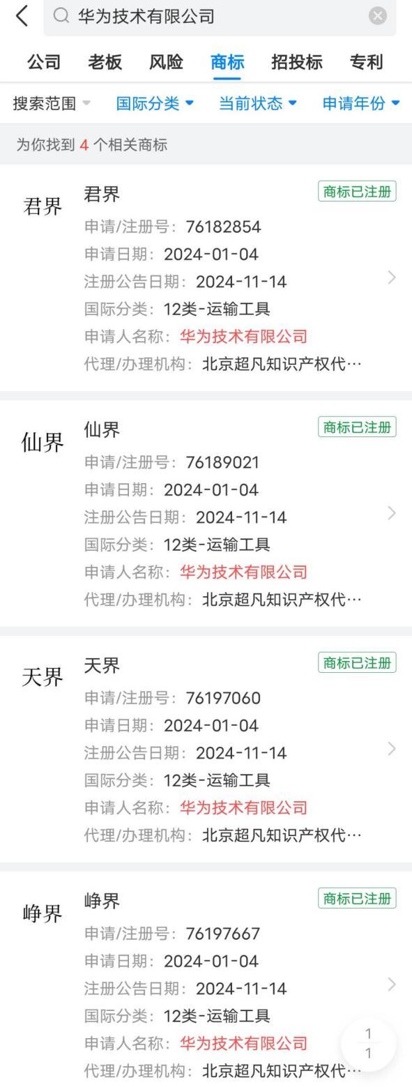 值得一提的是,华为迄今为止已申请近 200 个包含 " 界 " 字的商标。近年来,华为在智能汽车领域的布局不断深化,此举体现了其在提升品牌辨识度和构建品牌集群方面的长远布局。此外,有业内专家认为,这是华为的一种防御性策略,旨在防止其他企业或个人抢注类似商标,保护自身品牌利益。(实习生 / 慕容卓怡)