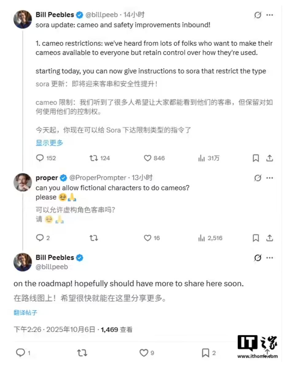 Sora 团队负责人 Bill Peebles 今日表示,虚拟角色在视频中的客串亮相 " 已列入开发路线图 ",Sora 将在未来引入正版的虚拟角色合作功能。
