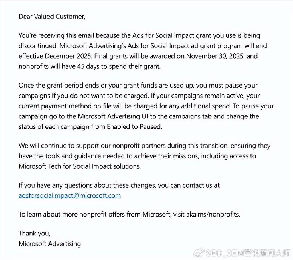 该决定终止了一项旨在帮助非营利组织通过免费广告资金扩大其使命的项目。从2026年开始,不暂停广告活动的非营利组织将面临被自动从其账户绑定的支付方式扣款的风险。