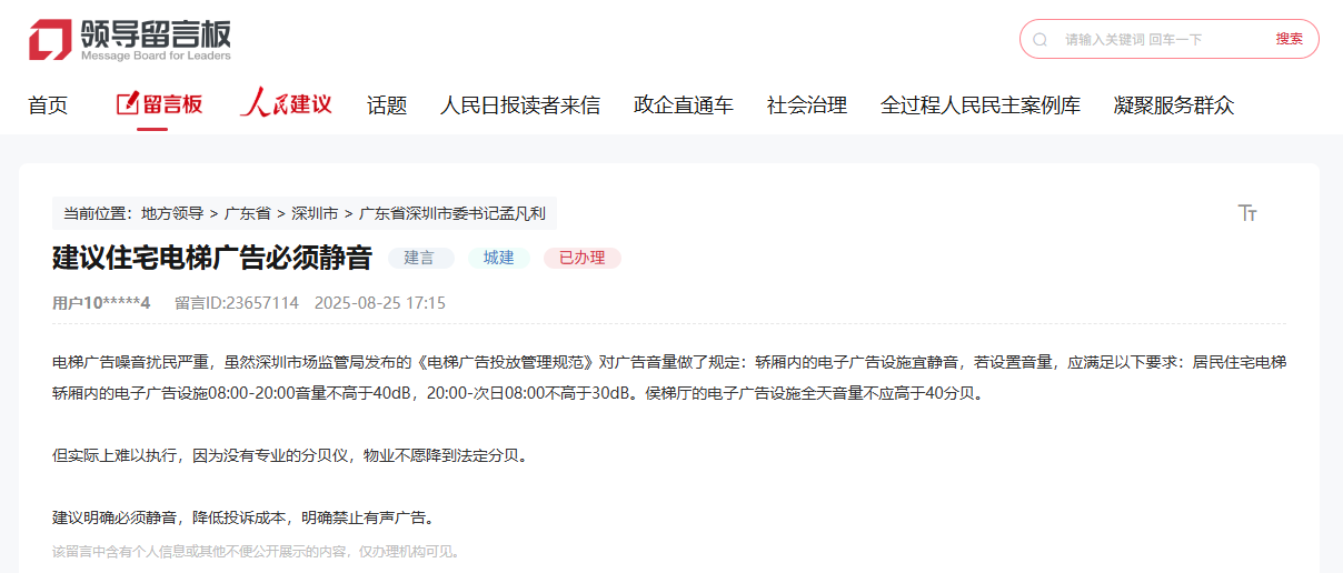 人民建议丨深圳网友呼吁电梯广告强制静音