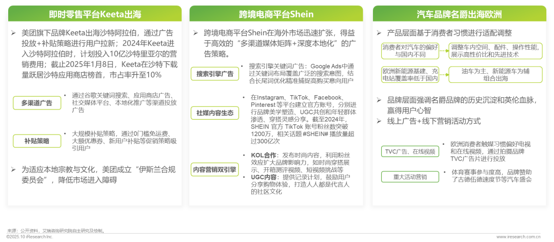 品牌本地化、人才本地化、渠道本地化构成出海企业进入海外市场的三大支柱,其中品牌本地化建设高度依赖广告营销。关键词搜索、社交媒体、电商平台等渠道的广告投放帮助企业实现用户增长、提高品牌曝光度和用户心智。