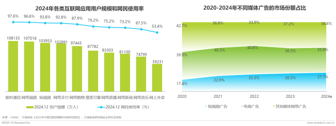 用户触媒习惯向线上媒介转移、注意力碎片化趋势明显。CNNIC数据,截至2024年12月,即时通讯、网络视频、短视频、网络支付、网络购物5类互联网应用的使用率均在85%以上。自2020年起,短视频广告市场份额占比持续增长,电商广告市场份额呈现波动。