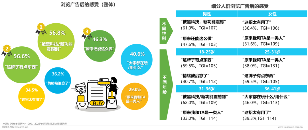 消费者浏览广告后核心感受主要集中在:新技术呈现产品的吸引力与实用价值、广告内容引发圈层身份认同、品牌价值理念触发情感连接。
