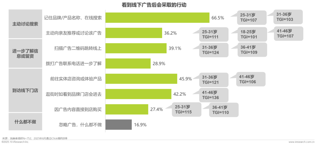 超过4成的消费者看到线下广告后会前往实体店咨询或者体验产品,亦或逛街遇到品牌门店直接进去;接近3成的消费者看到线下广告后直接到店购买。