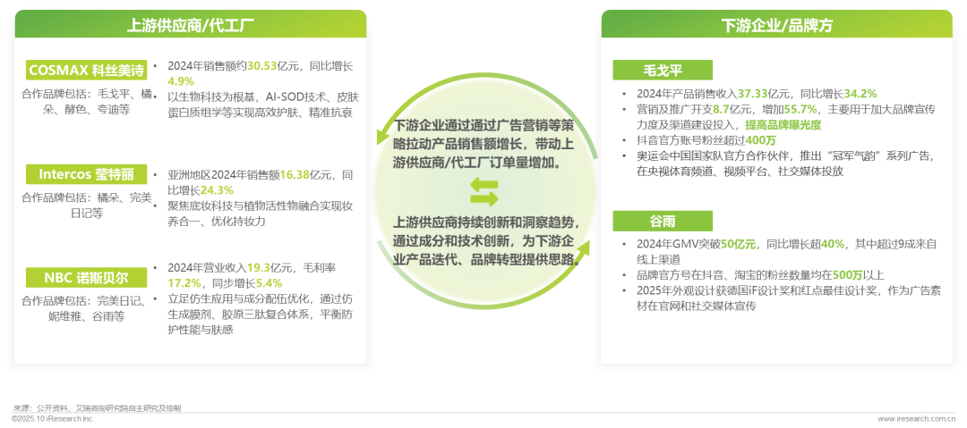 以化妆品产业链为例,营销杠杆撬动销量增长,带动产业链上下游规模效应,形成增长。