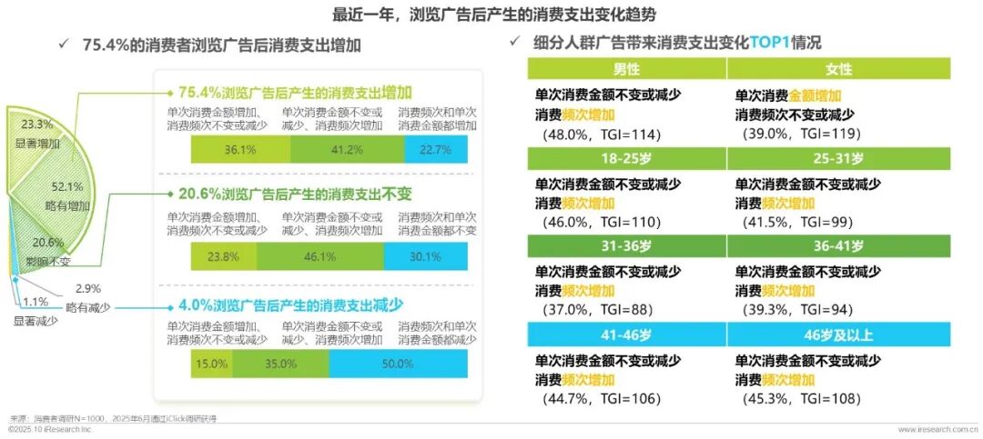 多数消费者在浏览广告后,会增加消费频次,但单次消费金额保持不变亦或减少;而细分人群来看,更多的女性消费者浏览广告后,单次消费金额有所提升。