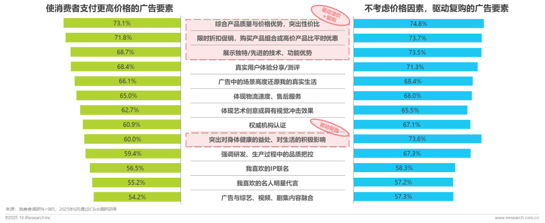 消费者支付更高价格的意愿受实际价值和产品性能驱动较多,决策过程理性,关注价格、功能或真实体验,复购时更加关注健康与长期价值导向。
