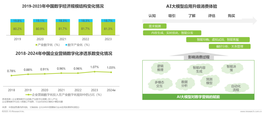 数字经济规模扩张稳步推进,企业进入营销数字化高速渗透期,大模型全方位升级消费者体验,技术发展推动数字营销全链路重构。