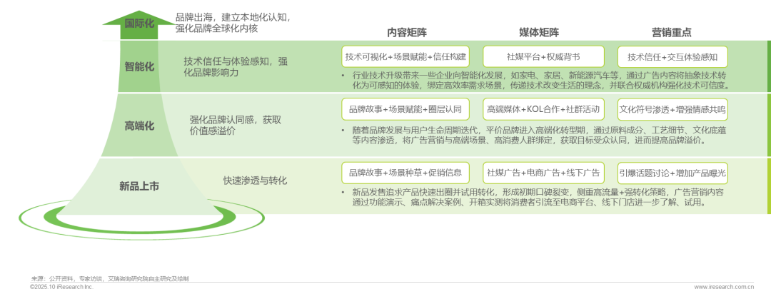 企业根据不同的营销目标制定广告策略,新品上市期要消除消费者“要不要试”的顾虑,高端化转型期要回应“贵了值不值”的疑问,智能化转型期要解答“是不是真有用”,品牌出海要突破“海外市场是否认可外来品牌”的壁垒。