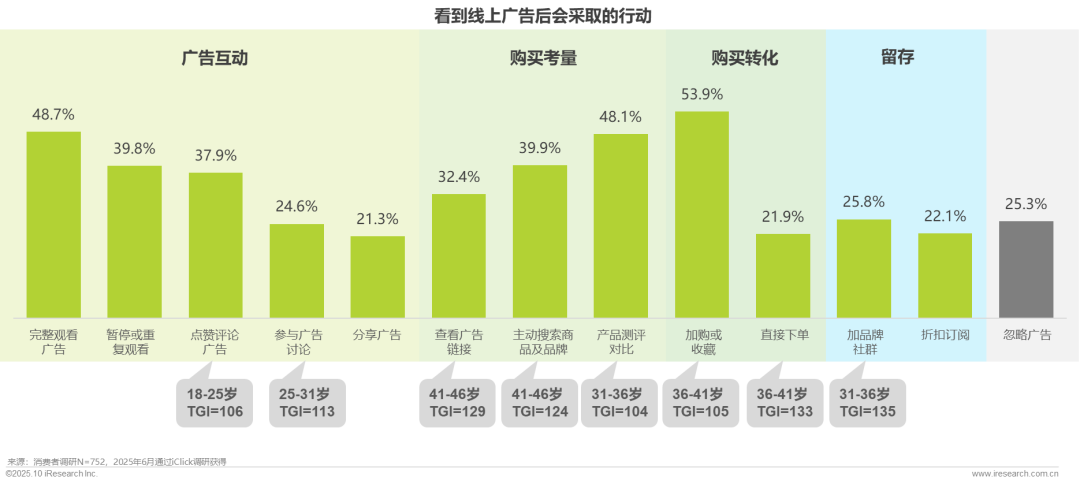 53.9%的消费者在浏览线上广告后会直接加购或者收藏商品,接近3成的消费者在浏览线上广告后直接下单;近4成消费者浏览广告后会主动搜索商品及品牌;接近一半的消费者浏览线上广告后进行产品测评及对比。