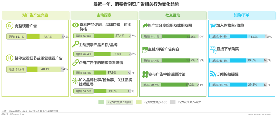 在浏览广告后有过加购或下单行为的消费者中,超6成在过去一年,浏览广告后直接加购或者下单的行为发生频次有所增加;有过广告互动行为的消费者中,超8成在过去一年转发、点赞/评论、参与话题讨论的频次增加。