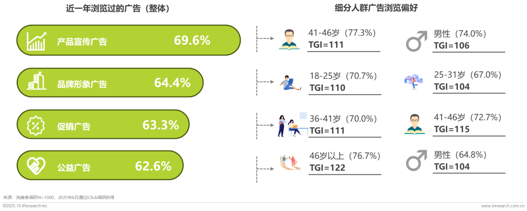 18-31岁的中青年消费者更关注品牌形象广告,36-46岁中年消费者对促销类广告更感兴趣,而46岁以上及男性消费者更喜欢浏览公益类广告。