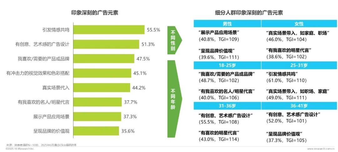 让消费者印象深刻的广告元素主要有:广告内容能引发情感共鸣、广告内容有创意,设计充满艺术感、广告内容涉及自己喜欢的产品或者品牌、广告视觉效果和色彩有冲击力。