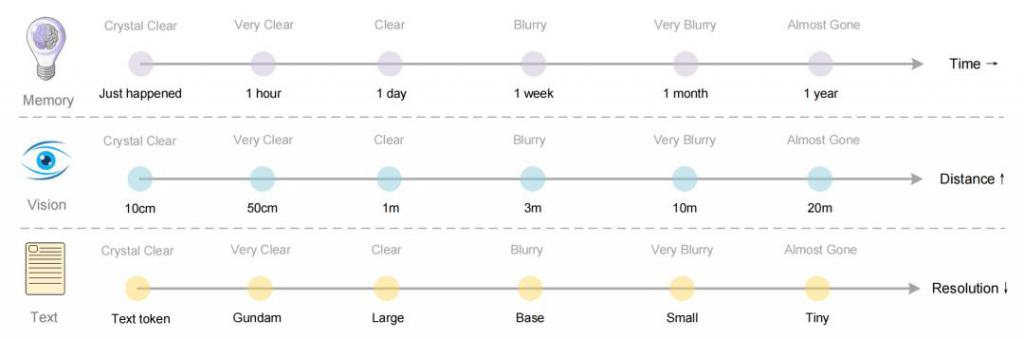 他们设计了一个实验设想:超过第 k 轮的历史对话内容,就渲染成图像;先压一遍,减少 10 倍 token;再久远一点,继续缩小图像尺寸;图像越小,信息越模糊,最终就 " 忘掉 " 了。