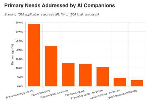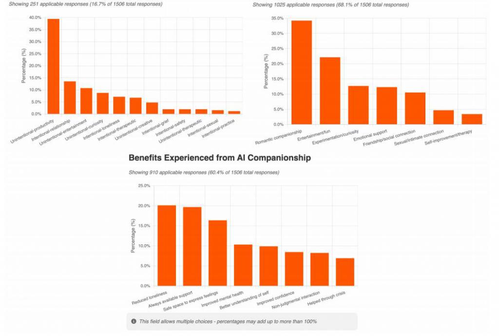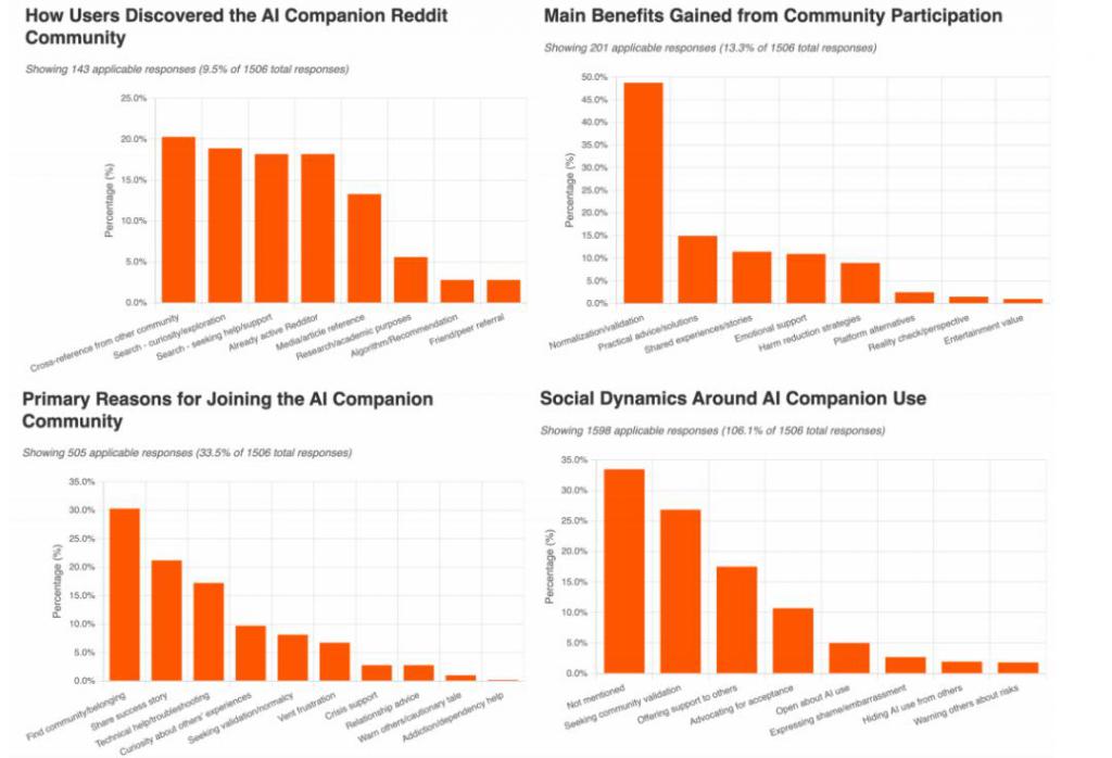 研究团队分析了 1506 条帖子,结果显示:只有 6.5% 的用户是主动来寻找 AI 伴侣,而 10.2% 的用户原本只是用 AI 来写东西、解难题,结果聊着聊着就变成了依赖。