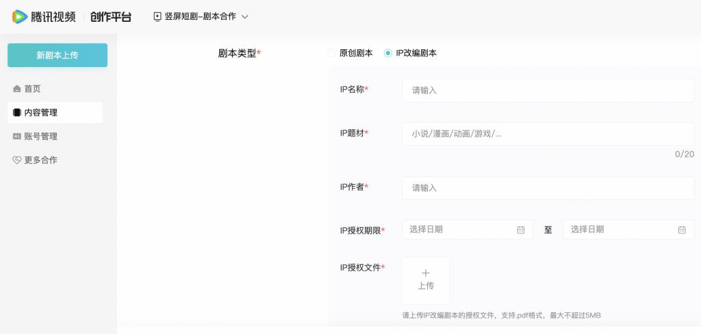 蓝鲸科技记者登陆腾讯短剧平台发现,腾讯剧本合作包括原创和 IP 改编两种类型,首次上传需要至少 30 集内容,以及剧情大纲梗概、人物小传等。和红果不同的是,若编剧要和腾讯合作 IP 改编剧本,需要自行获取 IP 授权并上传相关文件。