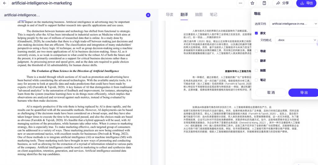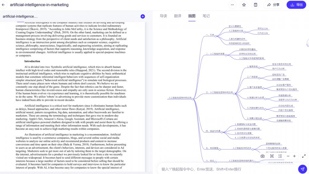 碰巧最近有篇英文论文,让它帮我总结一下。结果直接帮我整理好了摘要、翻译还保留排版,生成脑图,再导出一份文档。无限量、完全免费,这波够省钱。