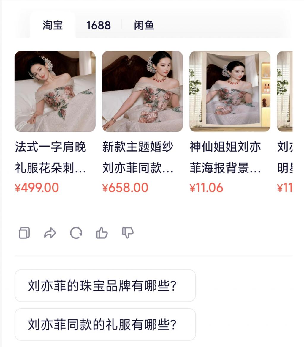 那就用千问的视觉能力来找找明星同款,老狐用刘亦菲红毯礼服试了一下。