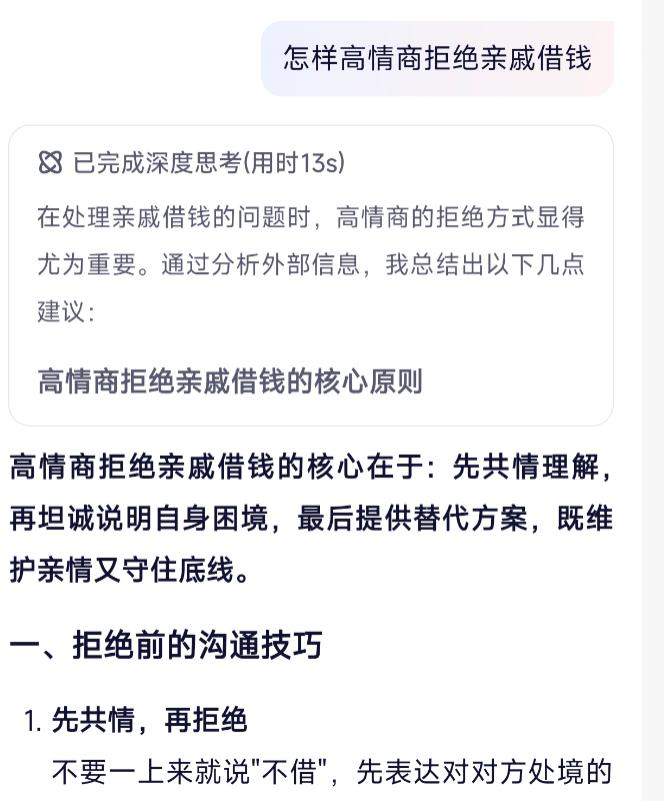 这么丝滑了,老狐就先来试试它的深度思考能力。随手问了一句:" 如何高情商地拒绝亲戚借钱?"